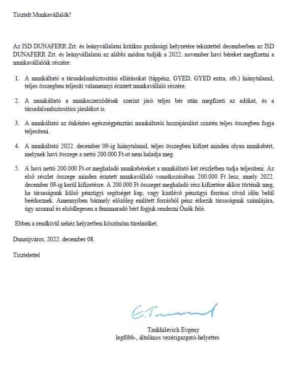 Miközben a 15/90/2022-11.30. kormányhatározat szerint folyik a leállás a Dunaferrnél, a fizetés napját megelőző munkanapon levelet kaptak a cégnél dolgozók. Ebben a helyzetben, karácsony előtt a fizetésük egy részét (nettó 200 ezer forintot) kaptak meg december 9-én, a fennmaradó rész kifizetéséig pedig "türelmet kér" a levél írója. Az, hogy a fennmaradó összegek kifizetése mikor történhet meg, már nem is szerepel dátum szerint az irományban, csak annyi: ...akkor, ha társaságunk külső pénzügyi segítséget kap, vagy kintlévő pénzügyi forrásai rövid időn belül beérkeznek. No comment! :-(