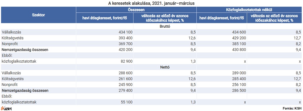 Márciusban a teljes munkaidőben alkalmazásban állók bruttó átlagkeresete 435 200 forint, a kedvezmények nélküli nettó átlagkereset pedig 289 400 forint volt a Központi Statisztikai Hivatal friss adatai szerint. Ez 8,7 százalékkal magasabb, mint tavaly ilyenkor. A 3,7 százalékos márciusi inflációval számolva a reálkereset így 4,8 százalékkal volt magasabb mint egy évvel ezelőtt. A teljes munkaidőben foglalkoztatottak bruttó medián átlagkeresete a munkáltatók teljes körét tekintve 335 400 forint volt a közfoglalkoztatottak nélkül - olvasható azuzlet.hu internetes portál cikkében.