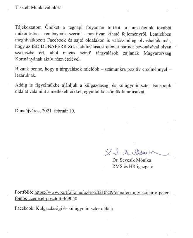 Erre erősít rá Dr. Sevcsik Mónika a Dunaferr HR és RMS igazgatója, a mai napon, a munkavállalóknak írt levelében, ami ITT olvasható.