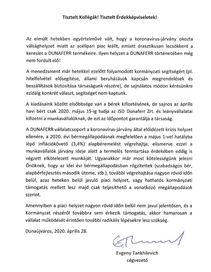 Tegnap a Dunaferr cégvezetője elektronikus levélben tudatta a munkavállalókkal, hogy az áprilisi fizetésüket, a május 10.-i határidőt kitolva, május 15.-ig fogja kifizetni. Azt is előrevetíti írásában, hogy az év elején a szakszervezetekkel kötött bérmegállapodás egyes elemeit, jelesül a májusi 3,4%-os alapbérfejlesztést - tekintettel a munkavállalók járványügyi helyzetben tanúsított helytállására – kifizeti, de a szabadságos bér és az alapbérfejlesztés második ütemének végrehajtása állami segítség nélkül nem kerül teljesítésre.