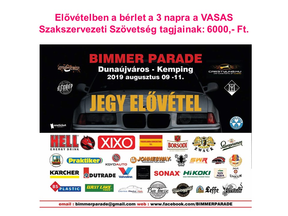 Kedvezményesen vásárolhatnak jegyeket tagjaink a dunaújvárosi, augusztus 09-11. között megrendezésre kerülő BIMMER PARADE-ra! Bővebb információ a jegyvásárlásról itt található!