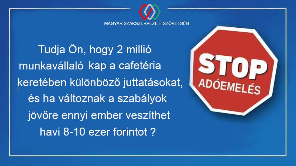A Magyar Szakszervezeti Szövetség több munkavállalói szervezetet képviselve kereste meg a kormnányt, hogy a cafeteria bizonyos elemeit őrizzék meg. A Versenyszféra és a Kormány Állandó Konzultációs Fóruma, valamint az Országos Közszolgálati Érdekegyeztető Tanács munkavállalói oldalát alkotó szakszervezeti konföderációk az egyes adótörvények és más kapcsolódó törvények módosításáról szóló törvénytervezettel kapcsoltban pénteken levelet intéztek a pénzügyminiszterhez.